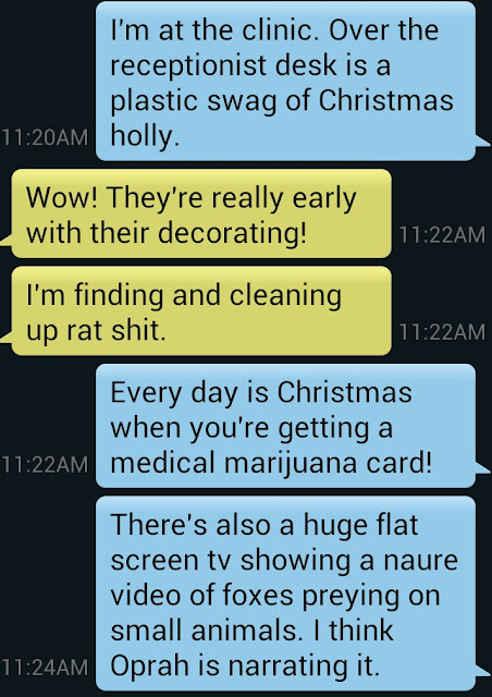 Yes, the name of the high dosage CBD extract that I purchased today is called Canatonic. I don't even know how to describe the morning's proceedings, the visit to Dr. Bullwinkle, the visit to the pharmacy, the procurement of the goods, the drive back home -- the actual giving it to Sophie. I think what I'll do is show you the texts that I exchanged with a friend (I'm in blue and the friend is yellow) -- and please note the time because the speed with which I acquired a medical marijuana card made me think I was a sort of Alice going down the rabbit hole.